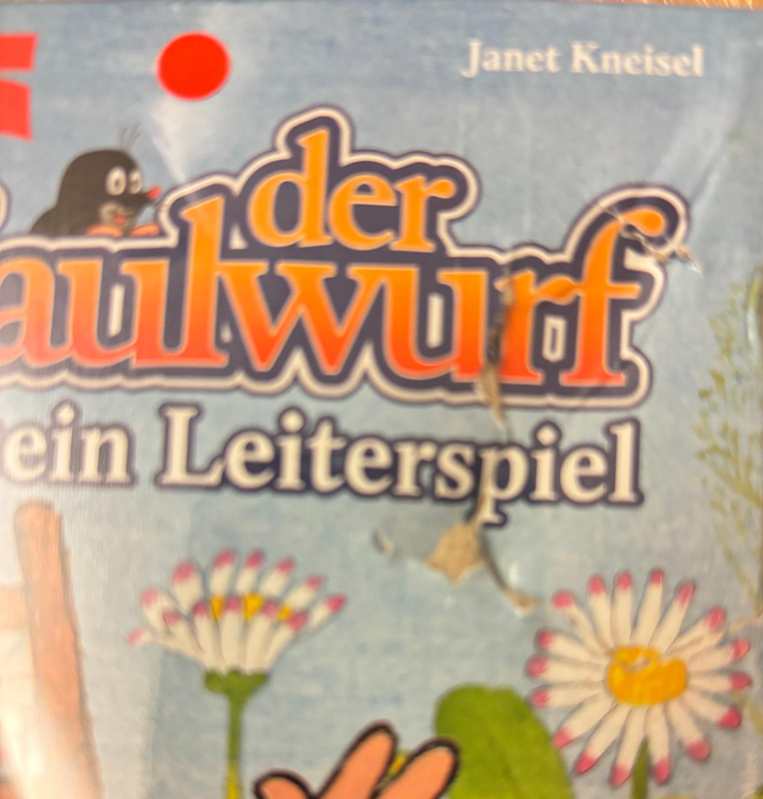 1 game plan (4 pieces), 4 cardboard figures + stand (mouse, hedgehog, rabbit, frog), 1 spinning top (consisting of cardboard disc and rotating arrow), 4 mole cards, 7 ladder cards, 1 game instructions